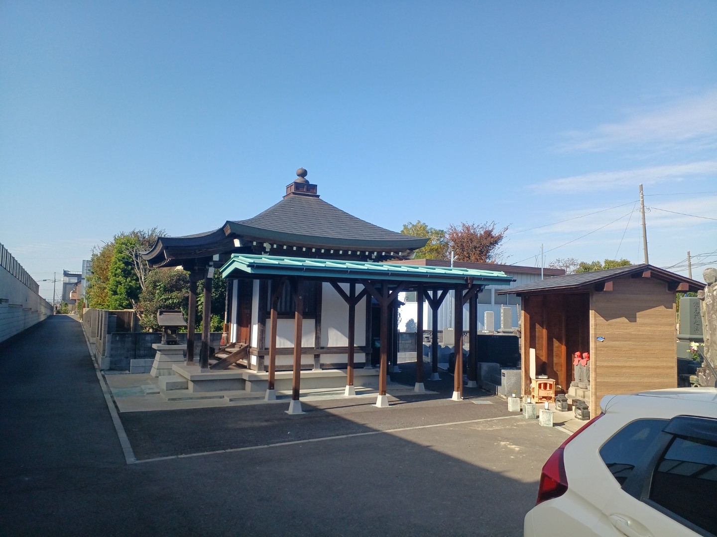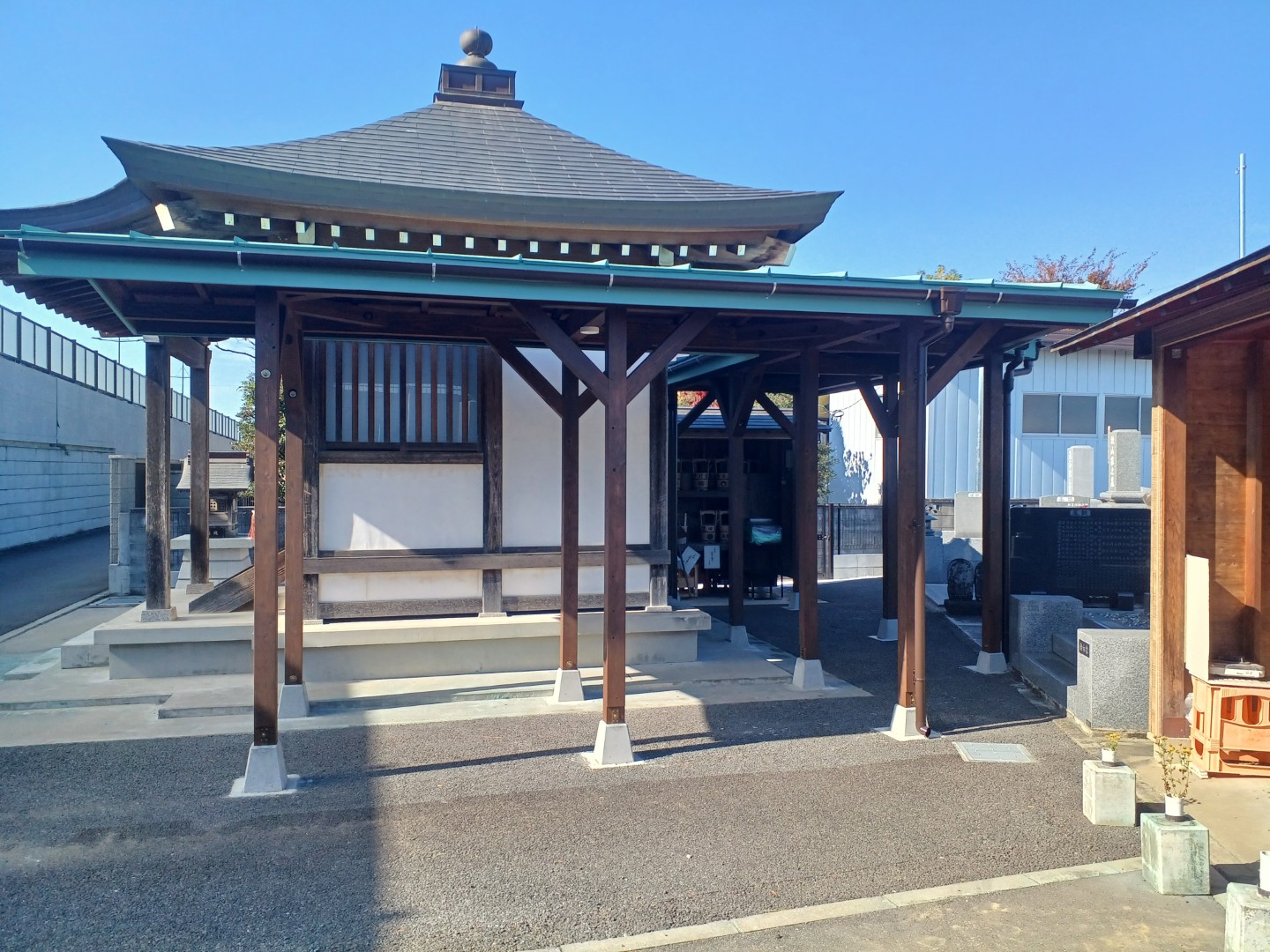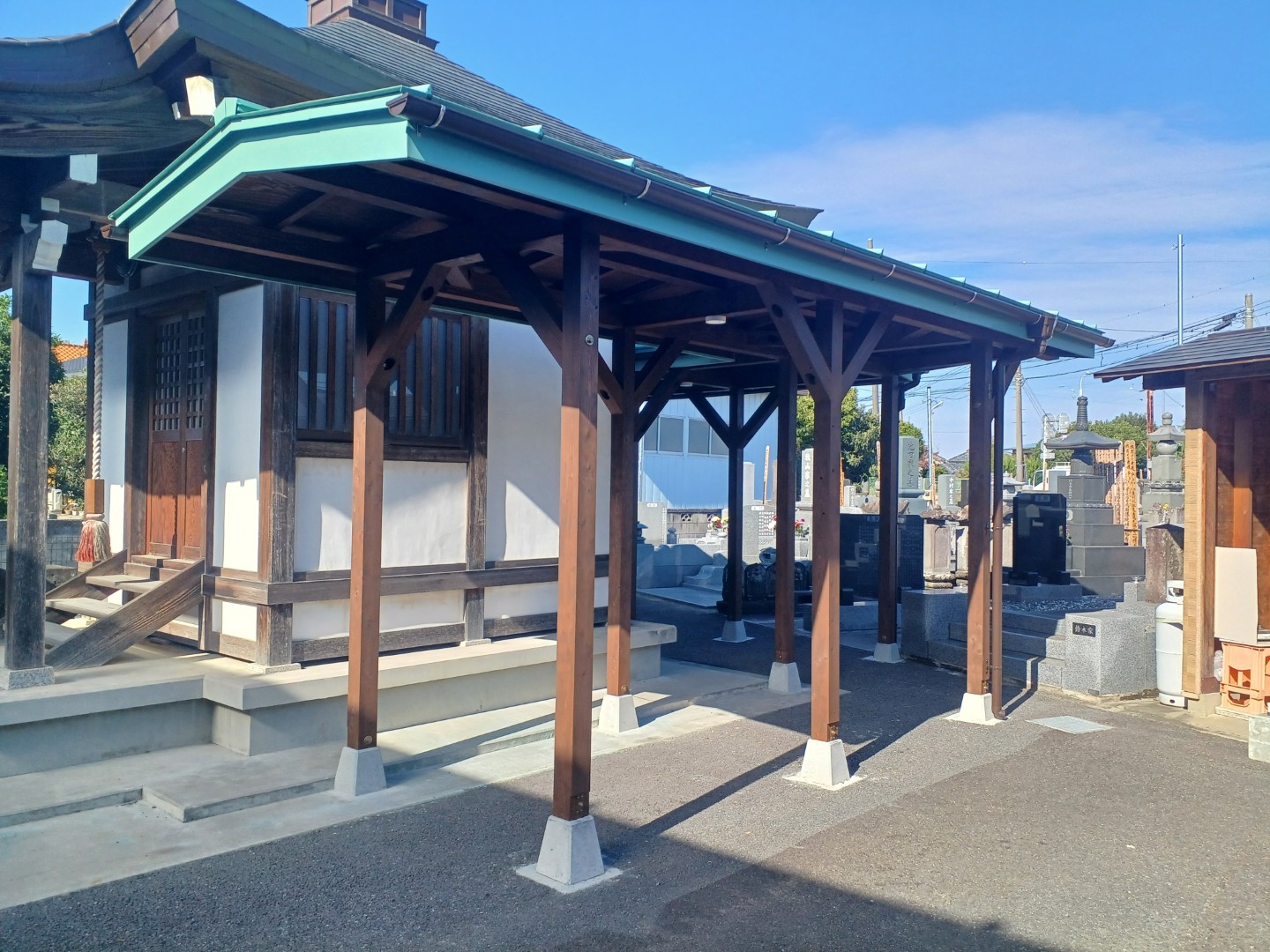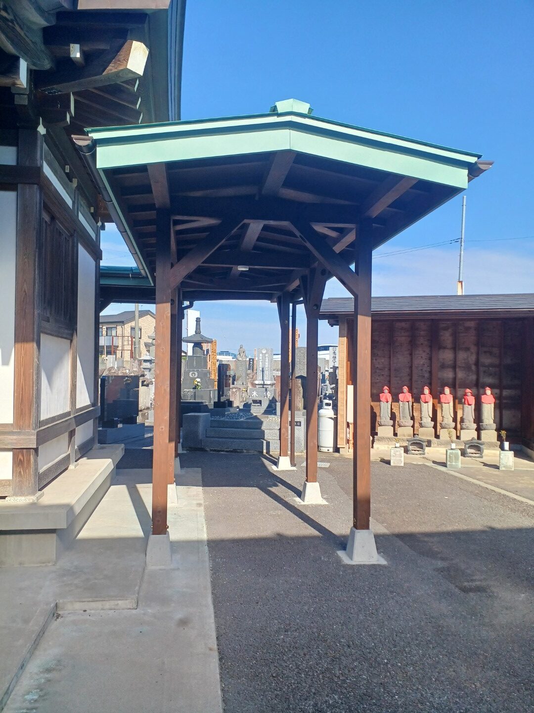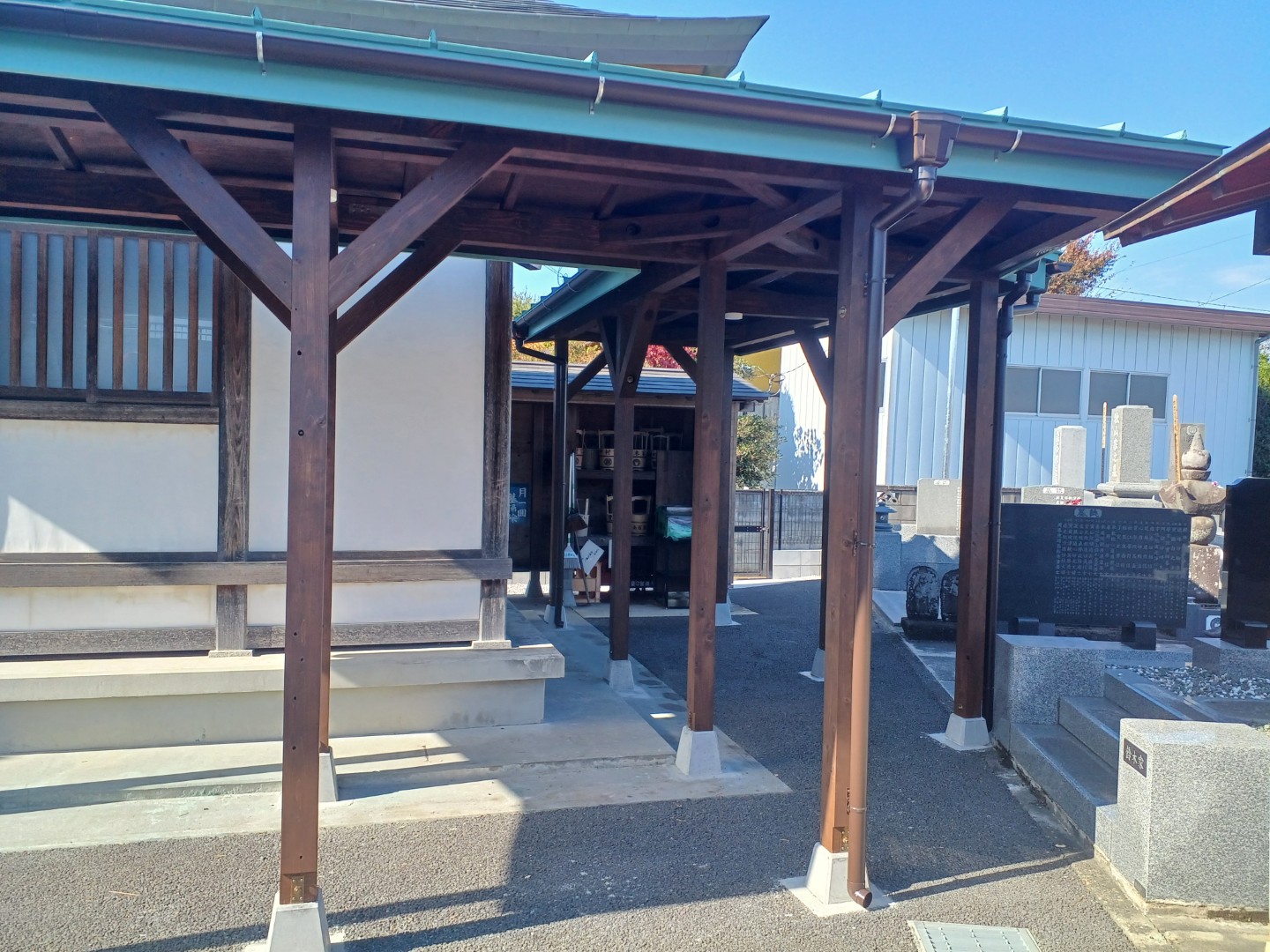 完成した通路屋根は、越谷市の寺院の景観に自然に溶け込み、参拝者からも好評をいただいています。雨の日でも安心してお墓参りができるようになり、法事の際の不便も解消されました。