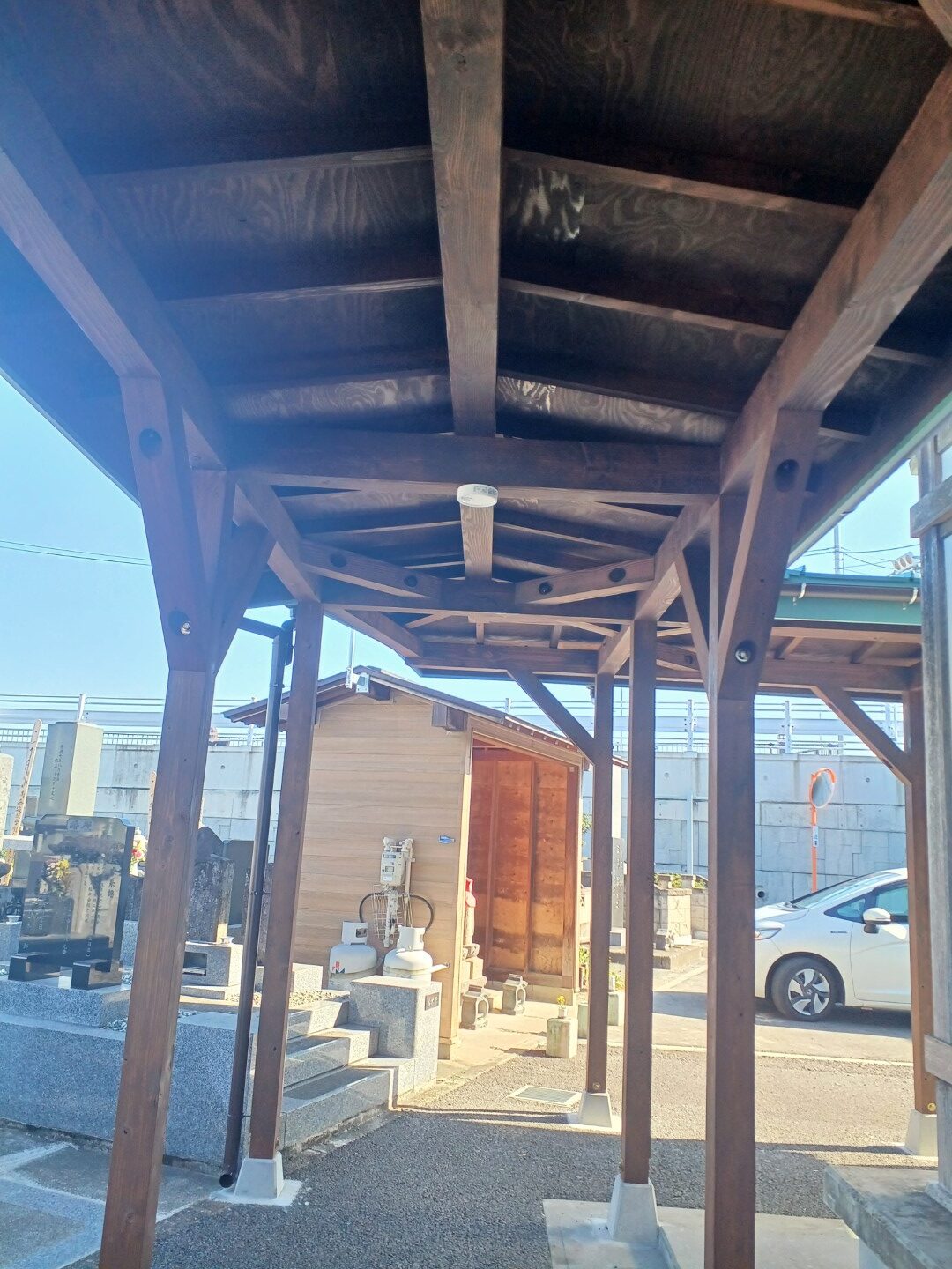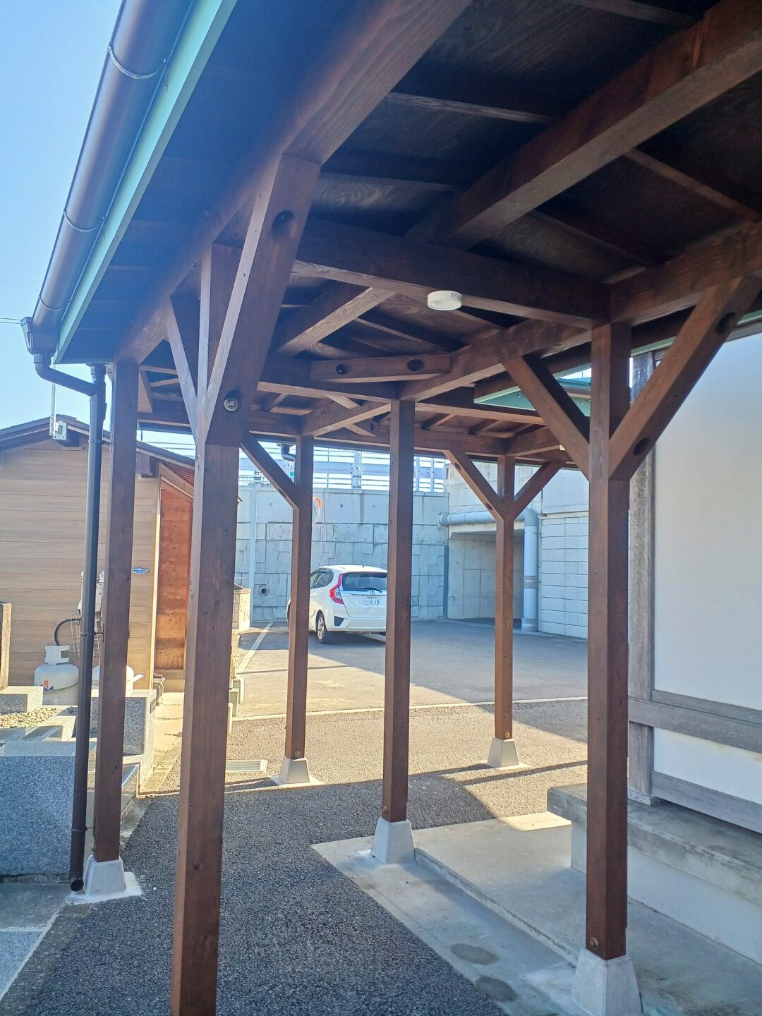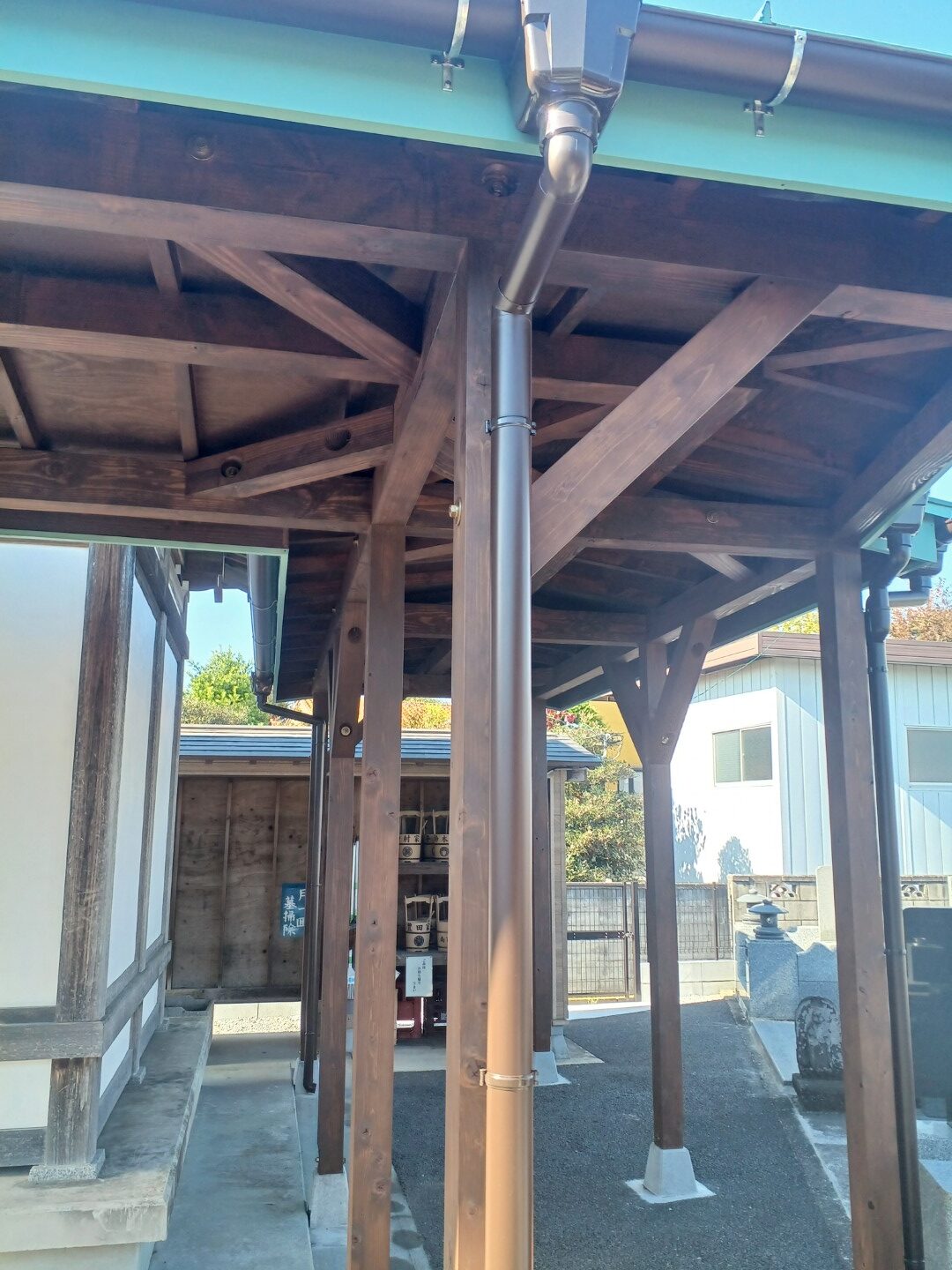 越谷市の墓地の通路屋根は、社寺の伝統的な趣を尊重しつつ、現代の耐久性を兼ね備えた材料を選びました。柱や梁には対候性のある木材を用い、塗装でしっかりと保護しています。屋根はガルバリウム鋼板を採用し、錆びにくく雨仕舞も丁寧に施工しました。