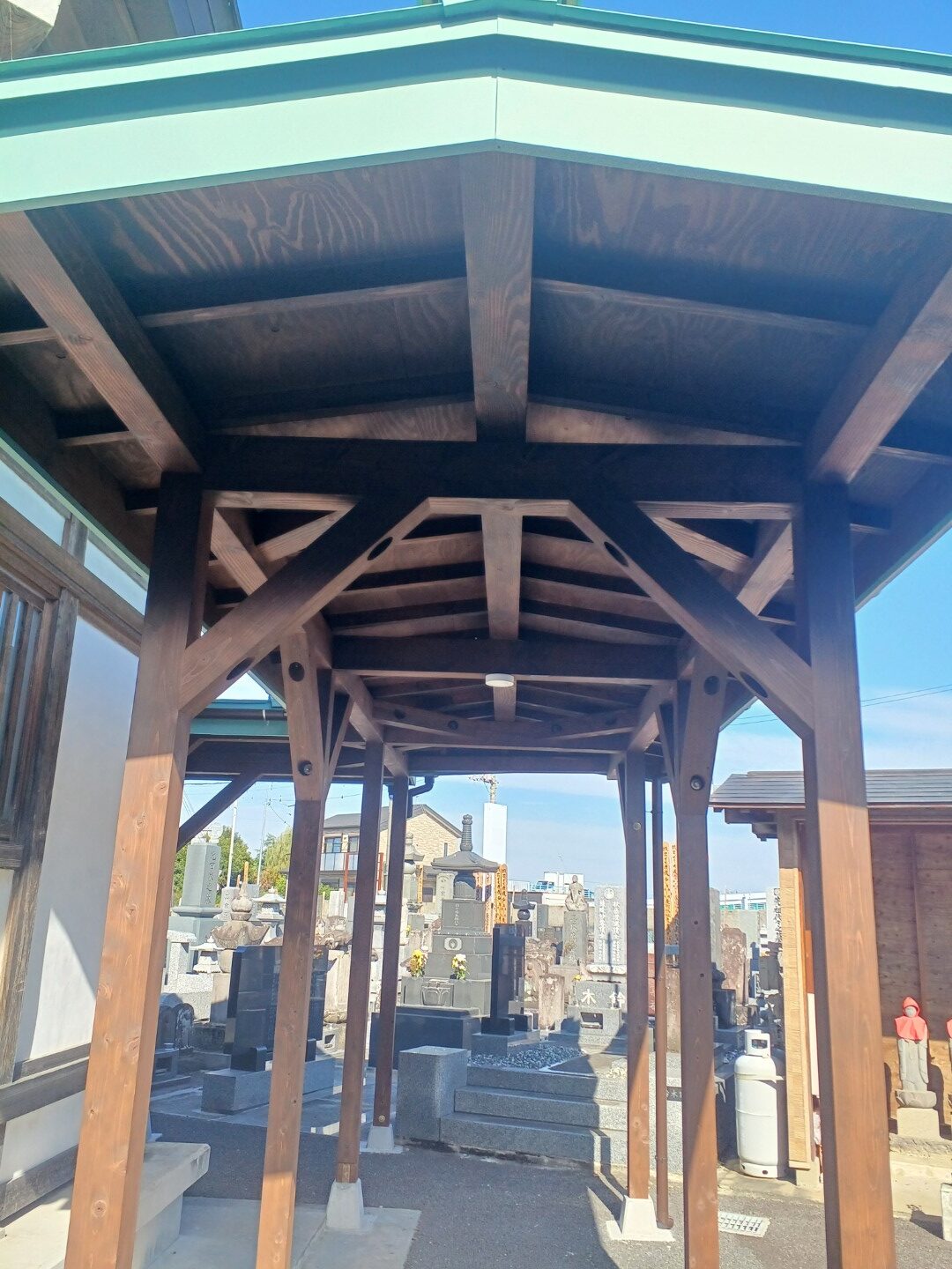 こんにちは、風間工務店 営業の風間です。今回は越谷市にある寺院の墓地通路に新規で屋根を建築した施工事例をご紹介します。寺の本堂から墓地へ向かう通路に屋根がなかったため、雨天時の法事やお墓参りがしづらいというお客様の悩みを解消する工事でした。