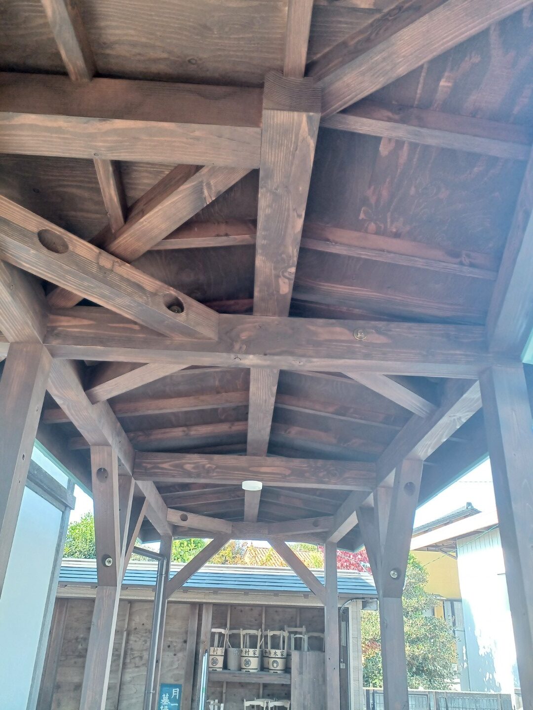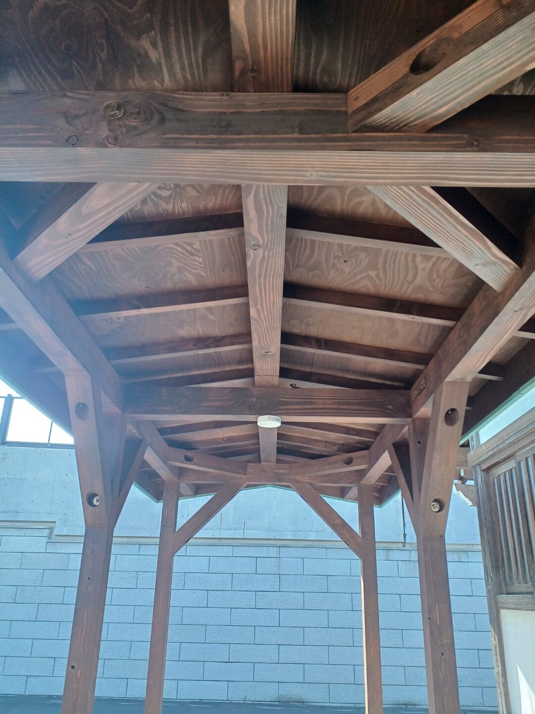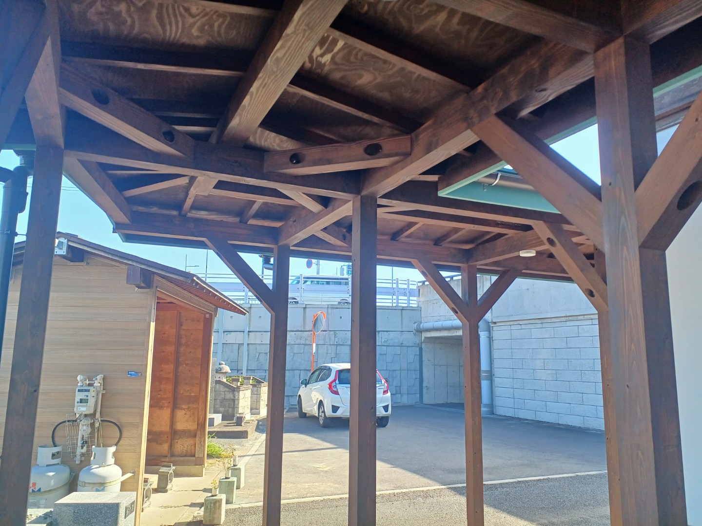 基礎はしっかりとしたコンクリートで設置し、木材の柱が地面からの湿気で傷まないよう配慮しました。屋根の構造は伝統的な社寺建築の技術を取り入れつつ、現代の建築基準に適合しています。