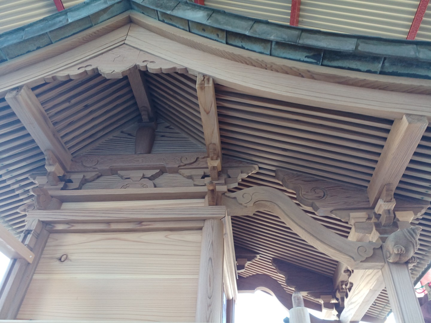 細かい木細工や蟻組みの部分は、元の意匠を尊重して同様の形状で作り替え・補強しました。屋根軒裏や木目の見え方にも配慮しています。